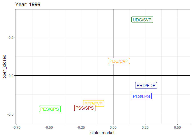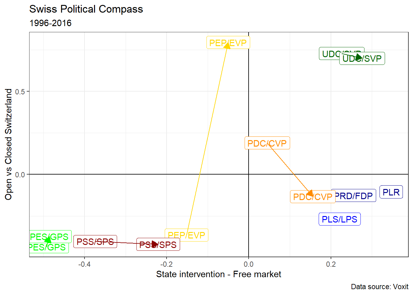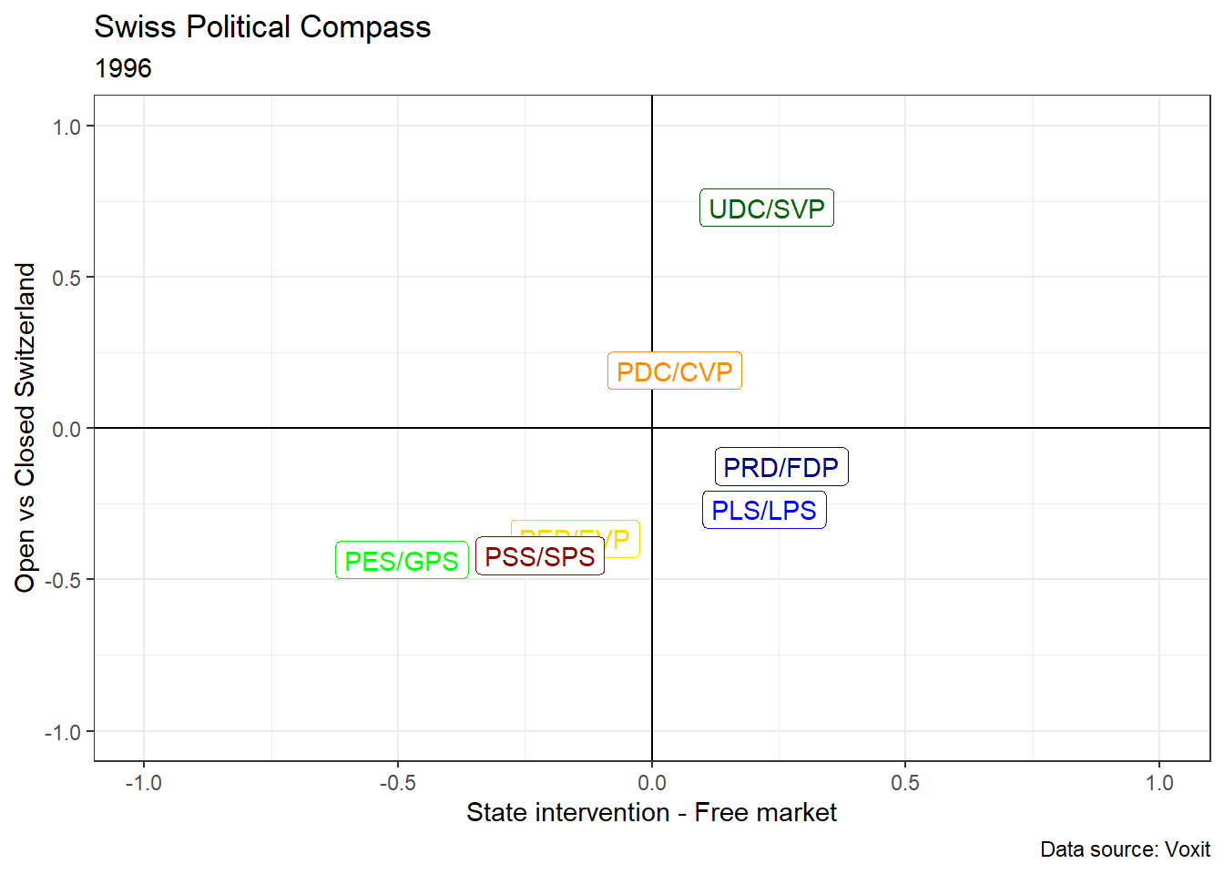 Let’s now plot a political compass for a given year. I choose the first year available: 1996. I also filter political parties to select only the most important ones: the Swiss Social Democratic Party (PSS/SPS), the Radicals (PRD), The Swiss Peoples Party (UDC/SVP), the Liberals, The Catholic-Conservatives (PDC), the Greens (PES/GPS), the Evangelical party (PEP/EVP).