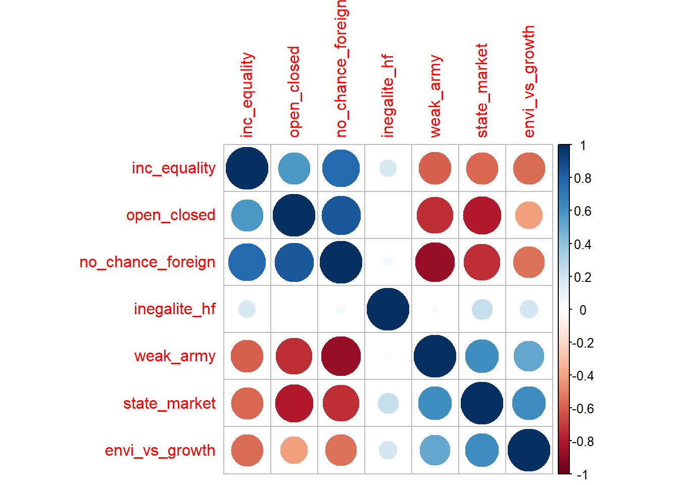 The correlation plots give coherent results overall. For example, the average of party supporters who declared not being in favor of equal chance for foreigners are also supportive of a isolated Switzerland (see “no_chance-foreign” - “open_closed”).