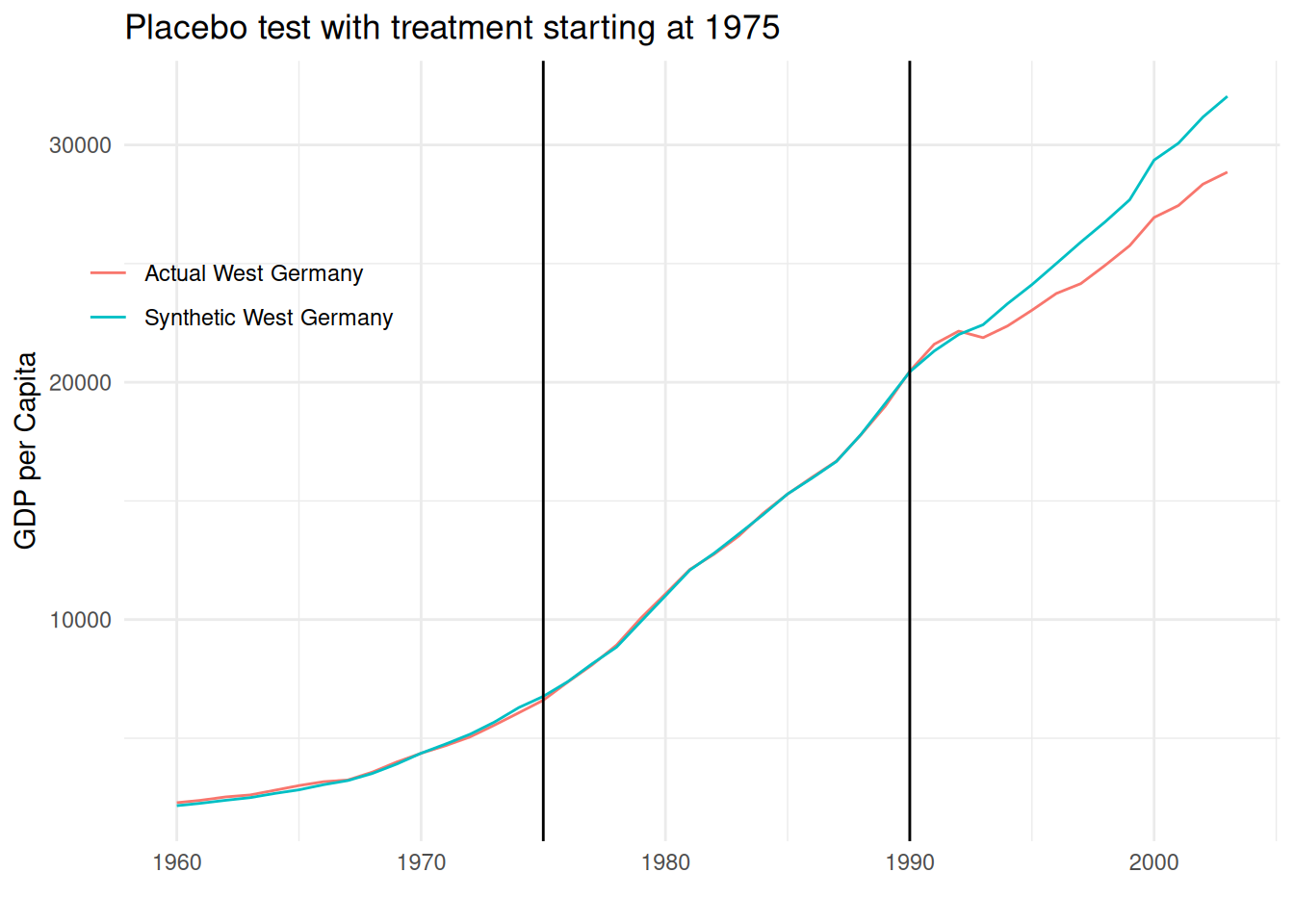 synthetic_west_germany2 = dataprep.out2$Y0plot %*% synth.out2$solution.wdata3 <- synthetic_west_germany2 %>%as_tibble() %>%rename(synthetic_west_germany ="w.weight") %>%mutate(west_germany = data$gdp[data$country ==17],year =1960:2003,gap = west_germany - synthetic_west_germany )data3 %>%ggplot()+aes(x = year, y = west_germany, color ="Actual West Germany")+geom_line()+geom_line(aes(y = synthetic_west_germany, color ="Synthetic West Germany"))+geom_vline(xintercept =1990)+geom_vline(xintercept =1975)+theme_minimal()+labs(x ="", y ="GDP per Capita",title ="Placebo test with treatment starting at 1975")+theme(legend.position =c(0.1, 0.7),legend.title =element_blank())