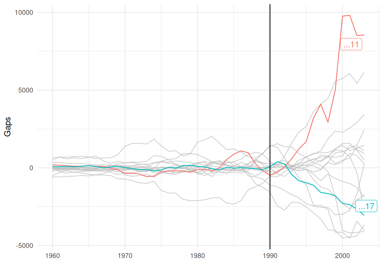 gaps =list()for (i in1:17) { dataprep.out <- Synth::dataprep(foo = data,predictors =c("gdp","trade","infrate"),predictors.op ="mean",time.predictors.prior =1960:1990,dependent ="gdp",unit.variable =10,special.predictors =list(list("industry" ,1981:1990, c("mean")),list("schooling",c(1980,1985), c("mean")),list("invest80" ,1980, c("mean"))),time.variable ="year",treatment.identifier = i,controls.identifier =unique(data$country)[-i],time.optimize.ssr =1960:1990,time.plot =1960:2003 )synth.out =synth(dataprep.out)gaps[[i]] = dataprep.out$Y1plot - dataprep.out$Y0plot %*% synth.out$solution.w}# transform the gaps list into a (tibble) dataframe, also adding the years and transforming into long format for ggplotgaps2 =as_tibble(gaps, .name_repair =c("unique_quiet")) %>%mutate(year =1960:2003) %>%pivot_longer(cols =1:17, names_to ="country", values_to ="gaps")
