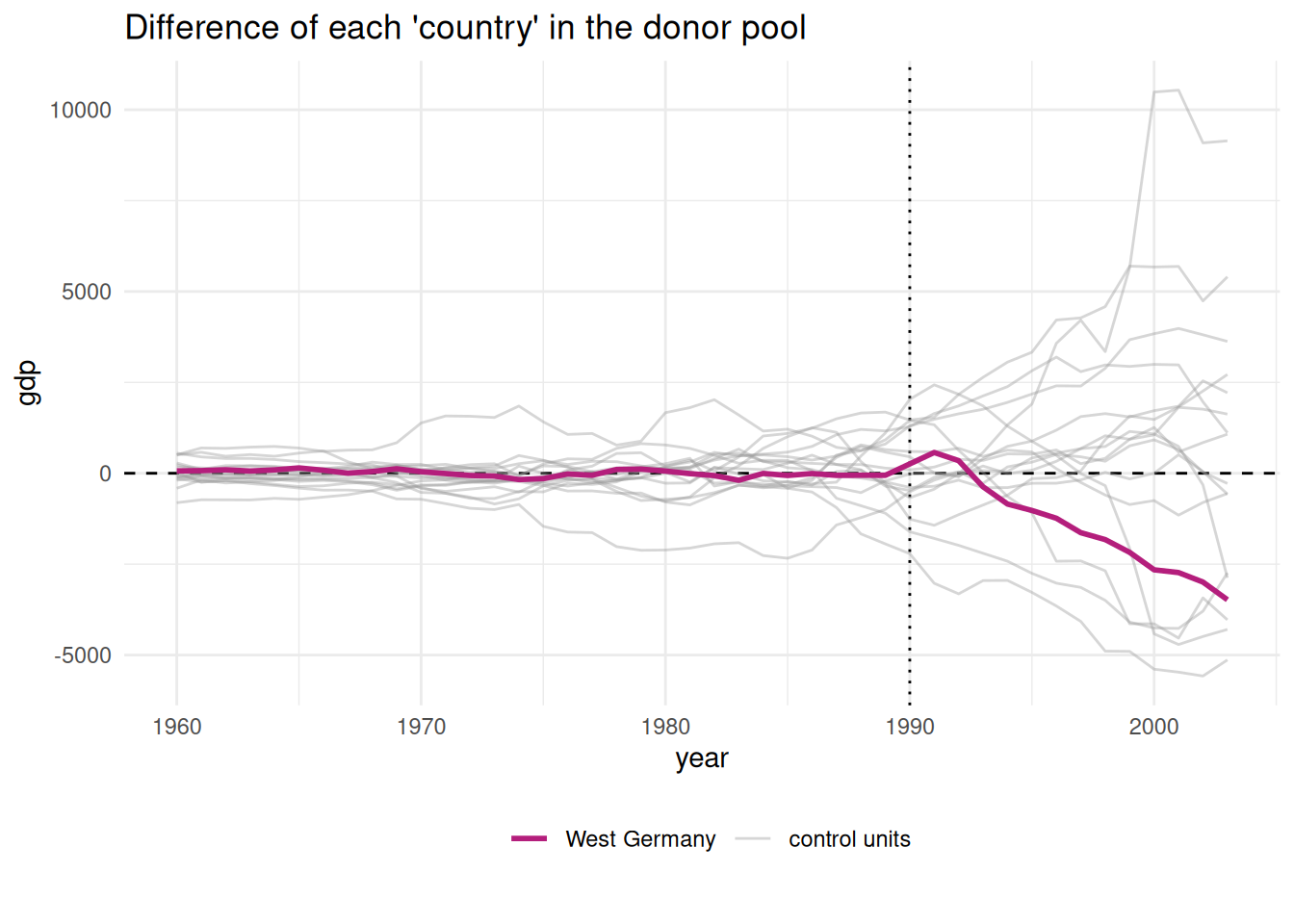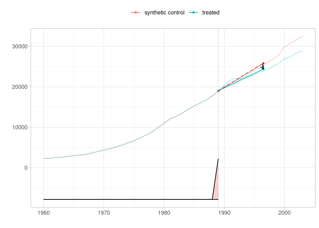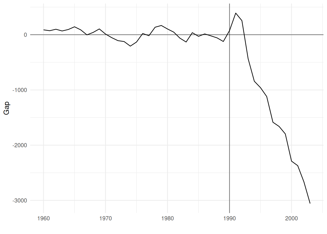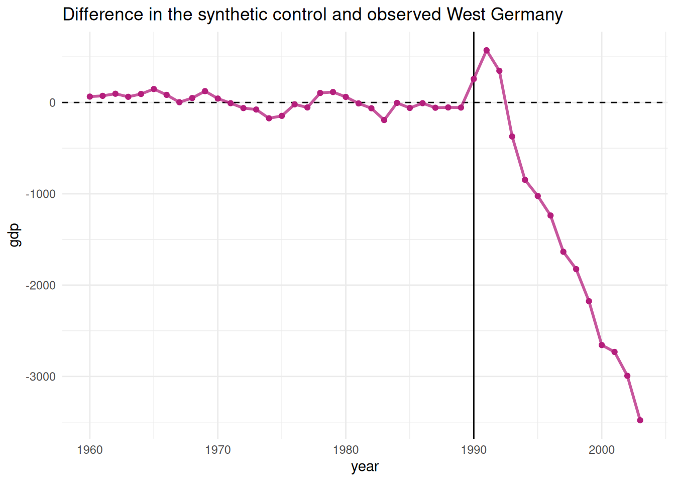 We can see that before reunification happened in 1990, the line for synthetic West Germany closely follows the line for actual West Germany, meaning that the synthetic index is a good approximation. After 1990, we can see that reunificated West Germany performed better than not-reunificated West Germany, but not for long as synthetic West Germany then grows faster than reunificated West Germany.