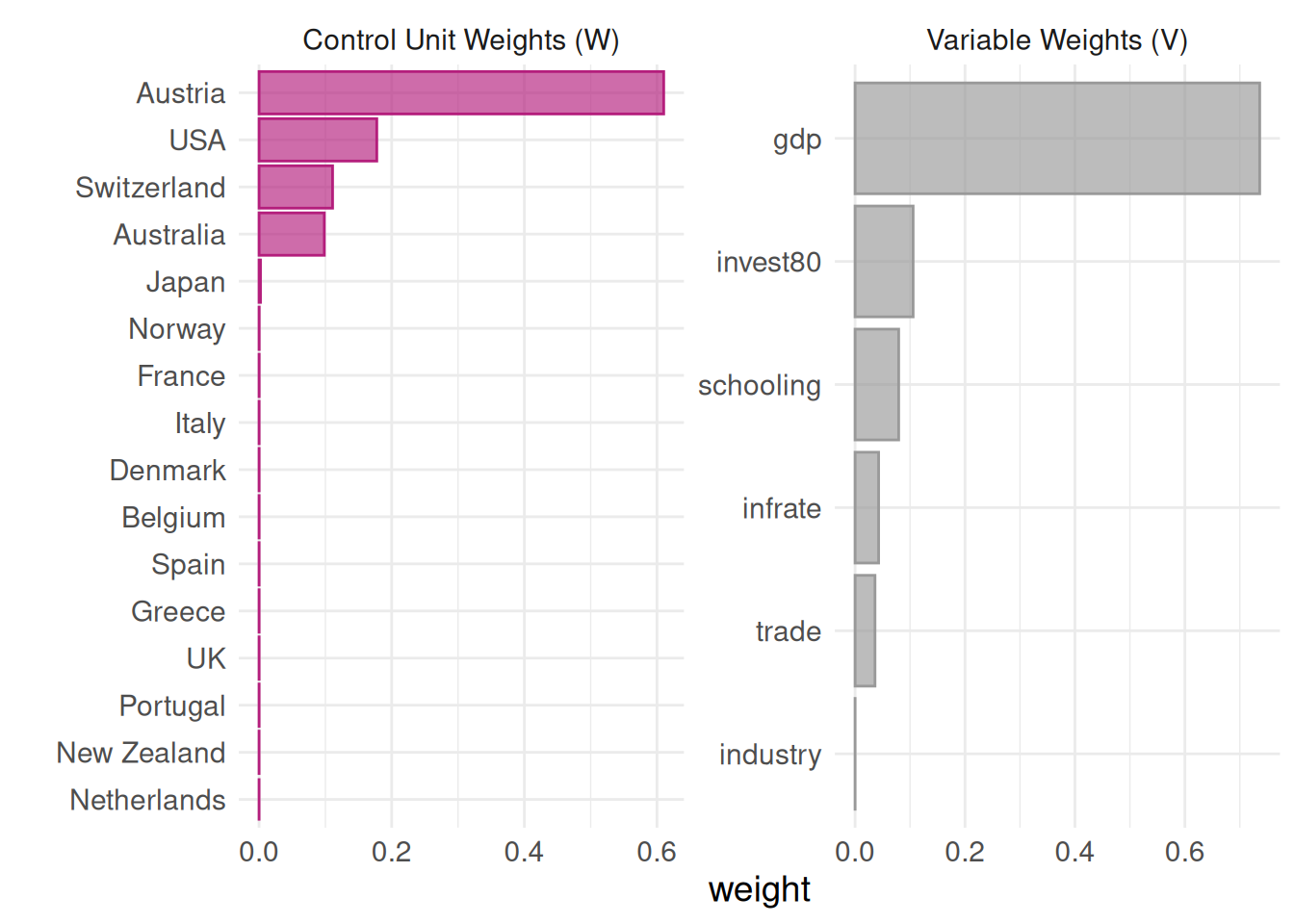 Checking the country weights is a particularly interesting feature of the synthetic control method, because these weights allow to see which countries are the best comparison units to our treated country. As a result, the synthetic control method can be useful to identify countries which best resemble our country of interest. Here, we can see that Austria captures almost half of the weights, Switzerland around 0.189 and the USA 0.14, whereas the remaining weights are very low.