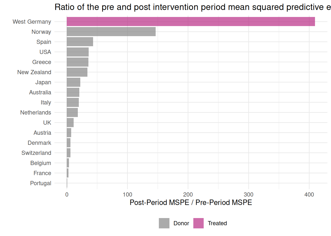 For instance, West Germany has the highest MSPE ratio and its rank is thus 1. Since we have 17 units in total, the p-value is \(1/17 = 0.0588\), slightly above the common significance threshold of 0.05. This is because we have only 17 countries in the sample and need to have at least 20 to get below the threshold (\(1/20 = 0.05\)).