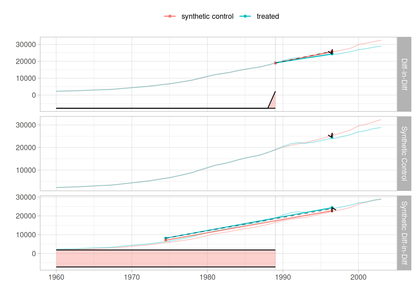 Another package which deserves to be mentioned here is synthdid which implements the synthetic control method presented above and one of its extension, synthetic difference in differences, elaborated by Arkhangelsky et al. (2021). The main difference with the synthetic control method is that synthetic difference in differences (SDiD) includes weights for time periods, motivated by the idea that time weights can remove bias and increase accuracy by eliminating the role of time periods that are very different from the post-treatment periods.