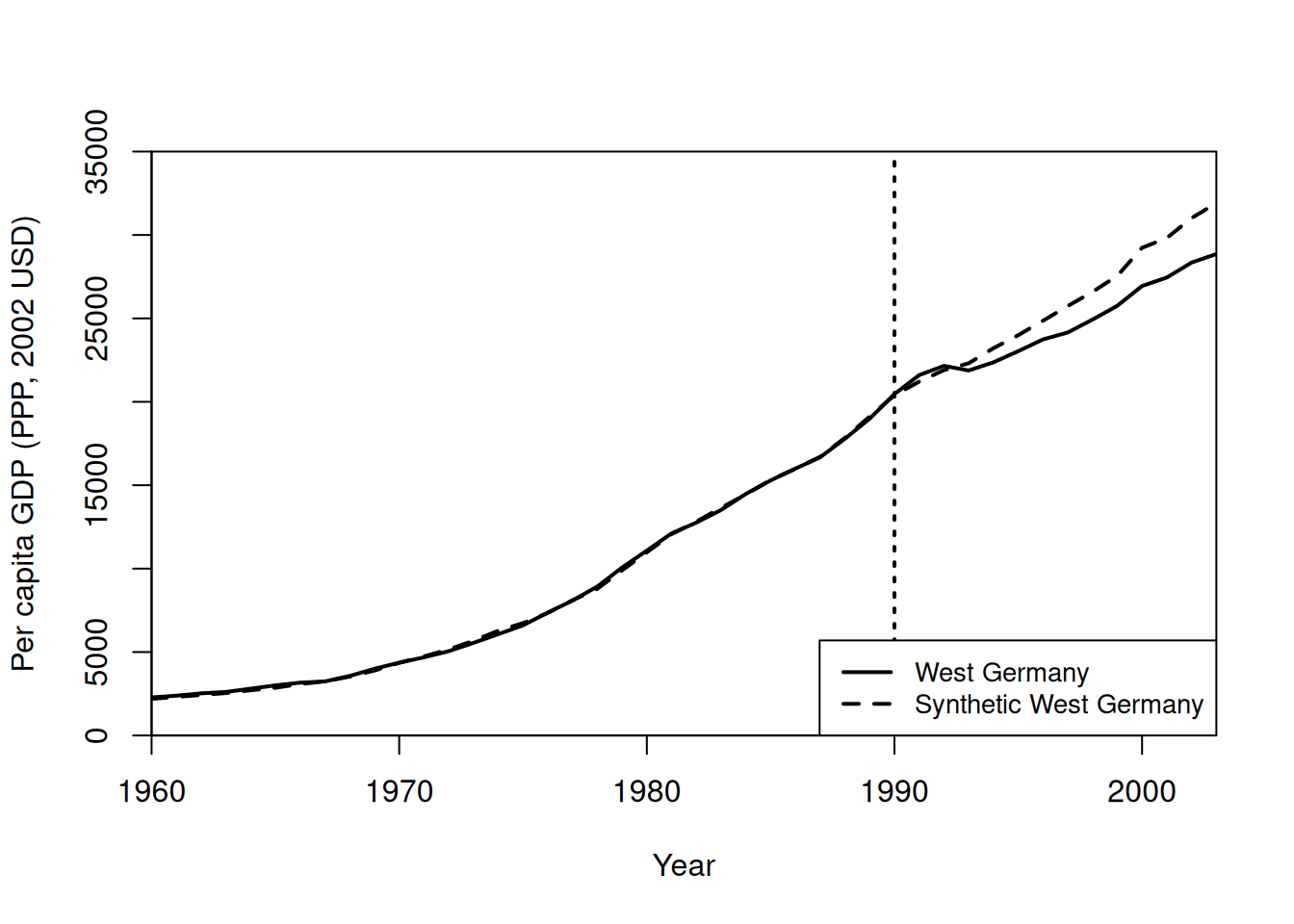 I will now show how the synthetic control method can be run in R by comparing three different packages Synth, tidysynth and synthdid. I will reproduce Abadie, Diamond, and Hainmueller (2015) ’s results on the negative effects of German reunification on West Germany’s economic growth.