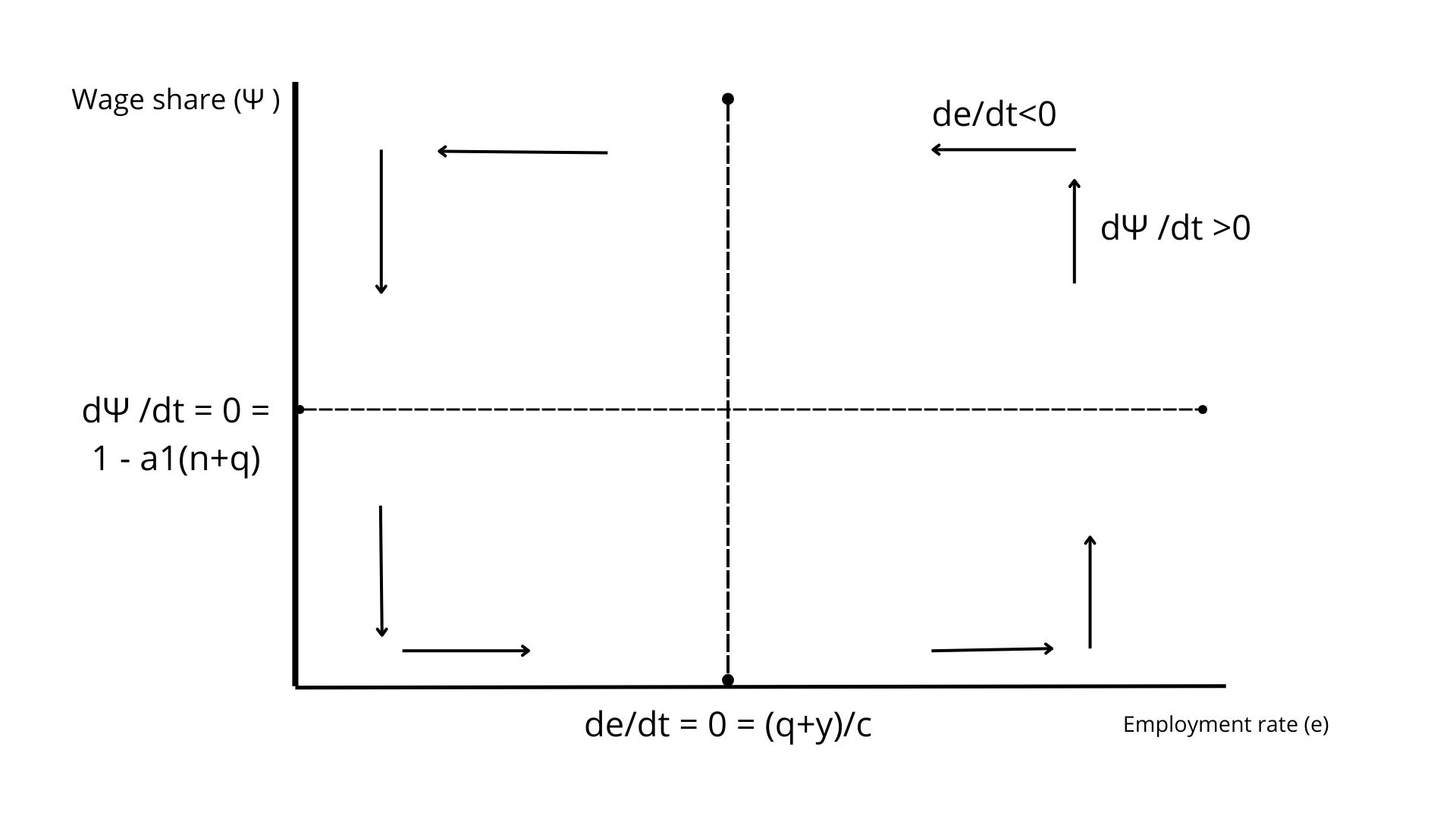 If one plots the level of the wage share \(\psi\) on the y axis against the level of employment \(e\) on the x axis, these two nullclines gives us one vertical line at \(\frac{q + y}{c}\) and one horizontal line at \(1 - a_1(n+q)\).